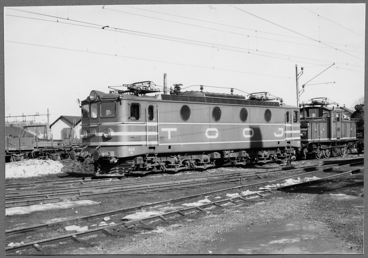 Tfv Grängesberg - Oxelösunds Järnvägar, TGOJ Ma 403. Loket tillverkades 1954 av ASEA och Falun.