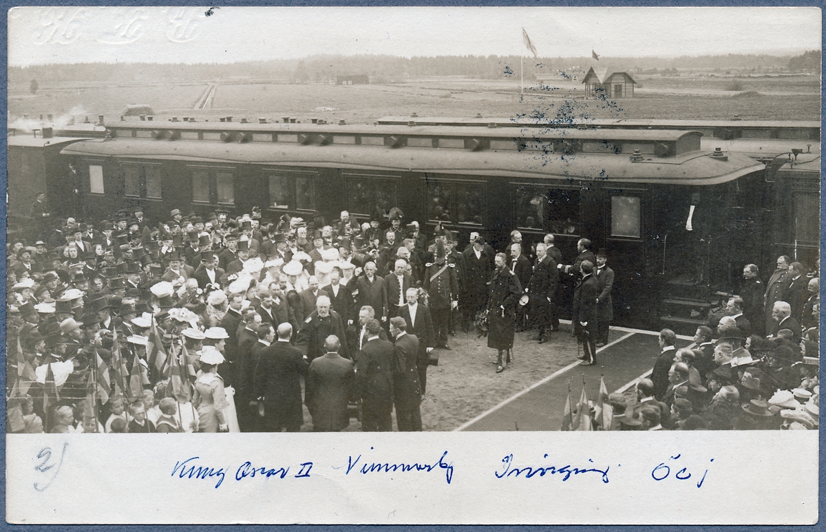 Invigning av Östra Centralbanans Järnvägar, ÖCJ. Kungen Oskar II tillsammans med krunprinsen Gustav V på besöket i Vimmerby.
