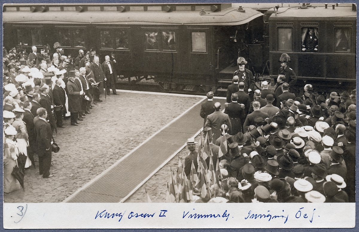 Invigning av Östra Centralbanans Järnvägar, ÖCJ. Kungen Oskar II tillsammans med krunprinsen Gustav V på besöket i Vimmerby.