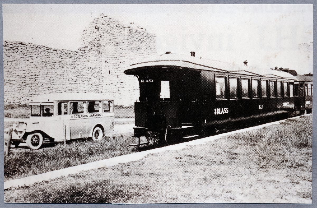 Gotlands Järnväg, GJ M1, GJ Co 2 personvagn 3:E klass samt GJ landsvägsbuss i Visby, på bansträckan Lärbro - Visby hamn. I bakgrunden syns ringmuren.
