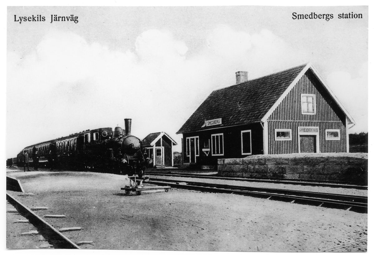 Kopia av vykort. Lysekils-Järnväg, LyJ lok 1 med vagnar vid Smedberg station.