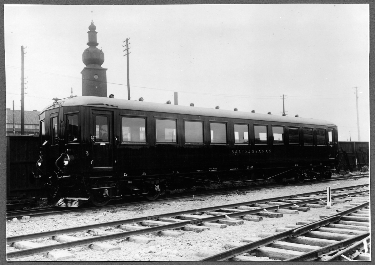 Släpvagn för motorvagn, Stockholm - Saltsjöns Järnväg, SSnJ Co 3, med tornet från Västerås konstmuseum i bakgrunden.