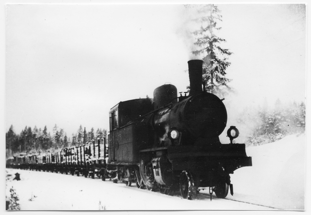 Godståg med ånglok på linjen mellan Rumskulla och Mossnäs. Norsholm Västervik Hultsfred Järnvägar, NVHJ lok 15.