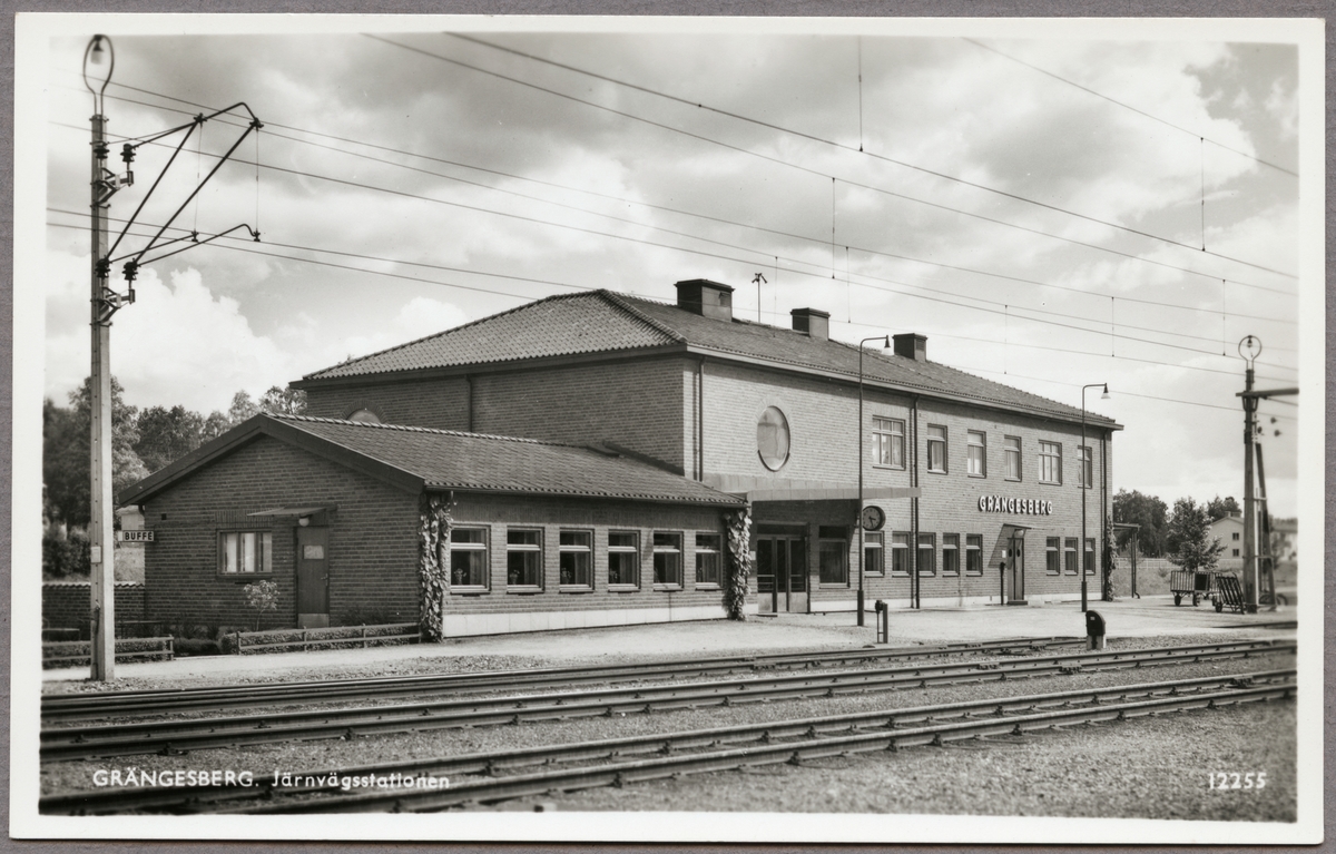 Titel: Vy på stationshus och del av elektrifierad bangård.