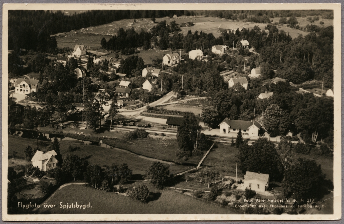 Spjutsbygd från ovan, med järnvägsstationen i centrum.