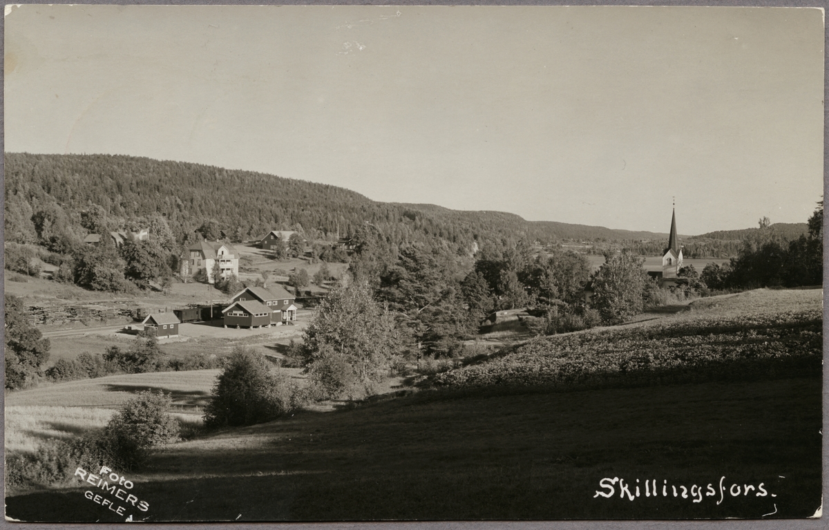 Foto från naturområde på bebyggelse med kyrka och station.
