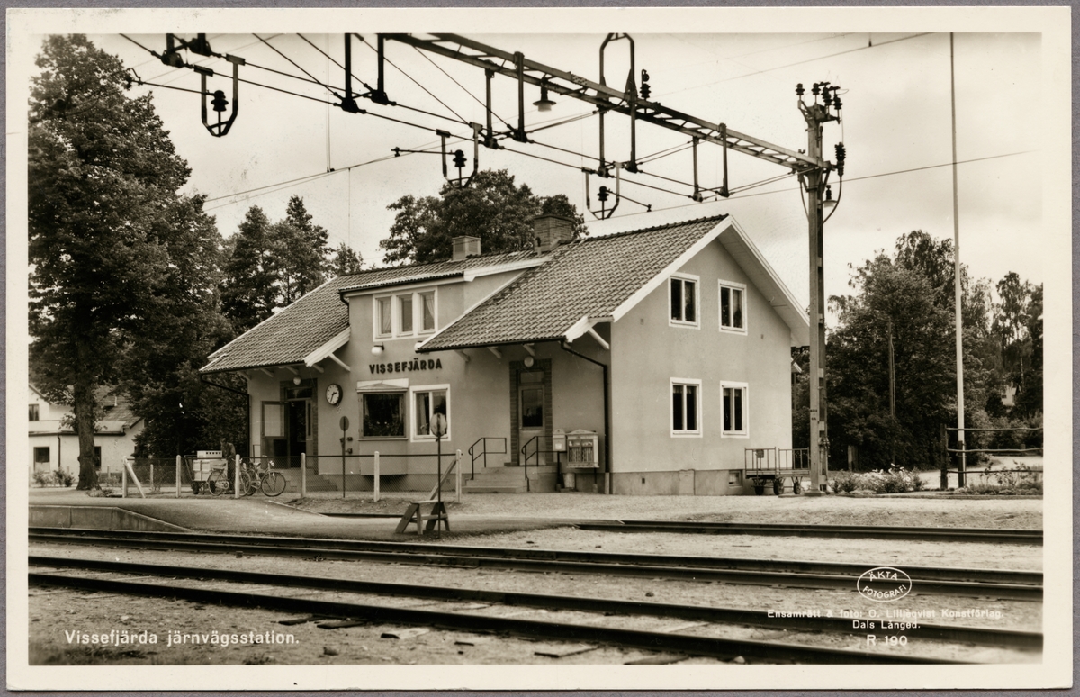 Spårsida av station med kontaktledningsbrygga och del av elektrifierad bangård i bild.