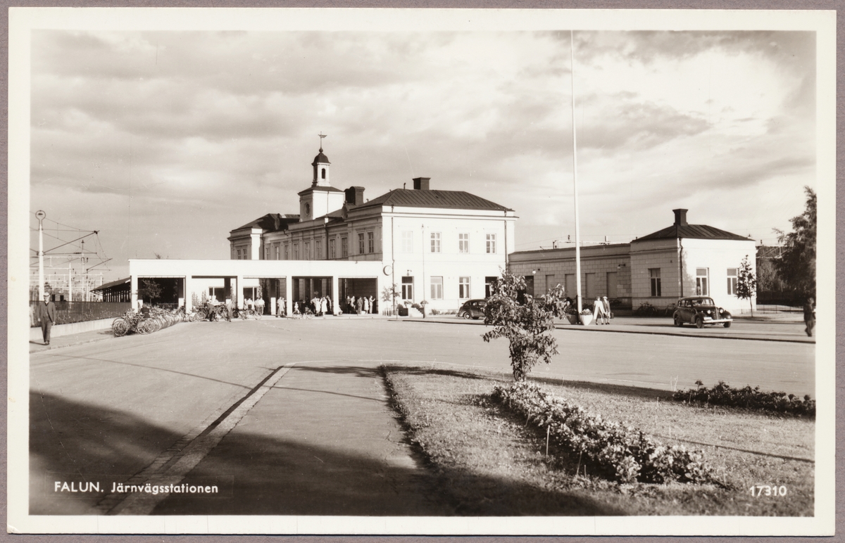 Titel: Vägsida av stationhus med resande och del av elekrifierad bangård i bild.