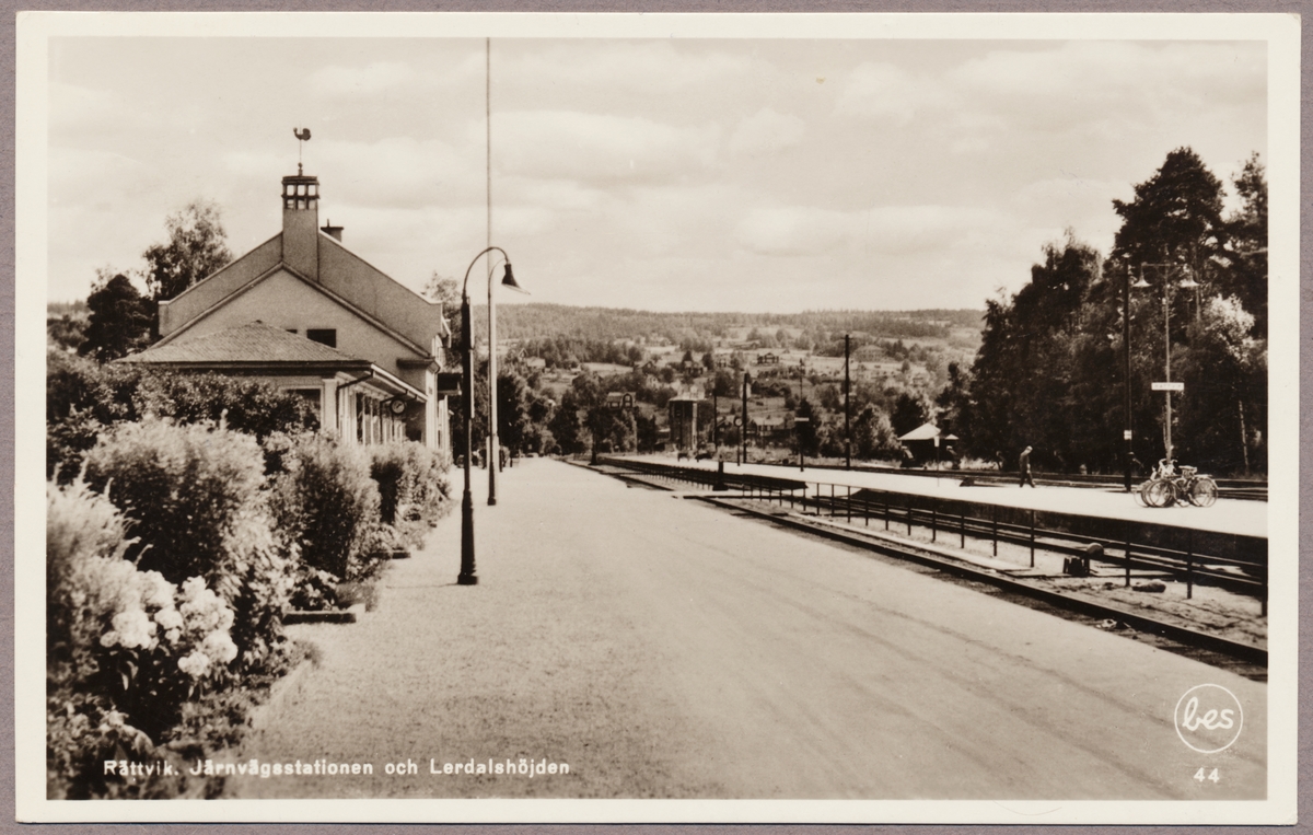 Titel: Vy på stationsområde och perronger med del av stationshus och väntsal i bild.
