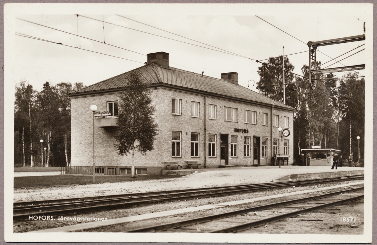 Titel: Stationshus och perrong vid elektrifierad bangård.