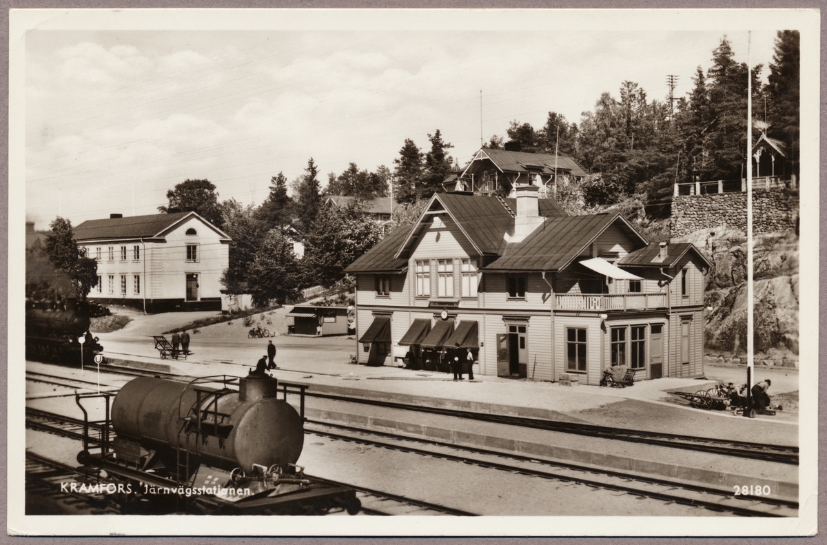 Titel: Stationsområde och perrong med bebyggelse i bakgrunden.
