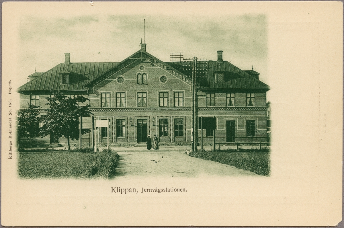 Titel: Stationshus med kvinnor och telefonstolpe i bild.