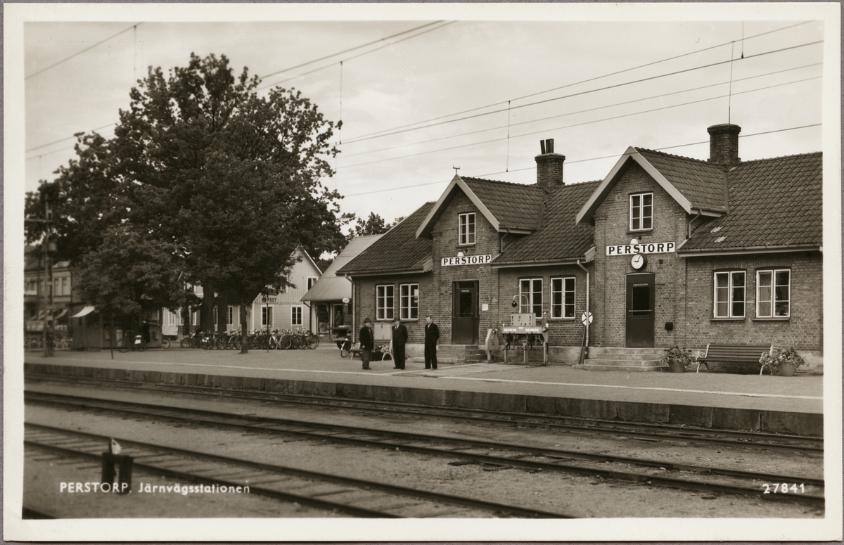 Titel: Spårsida av station med män på perrong och bebyggelse i bakgrunden.
