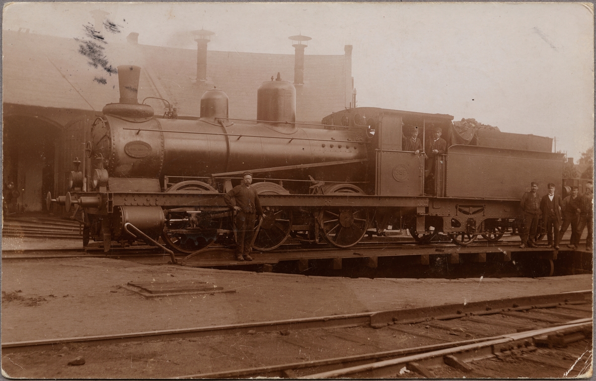Ånglok med personal på vändskiva.