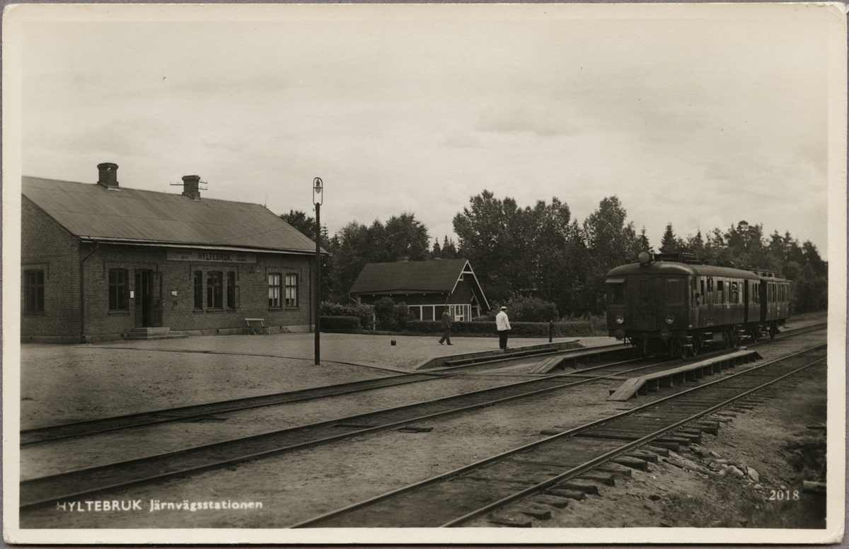 Titel: Stationsområde med spårsida av stationshus och motorvagn vid perrong.