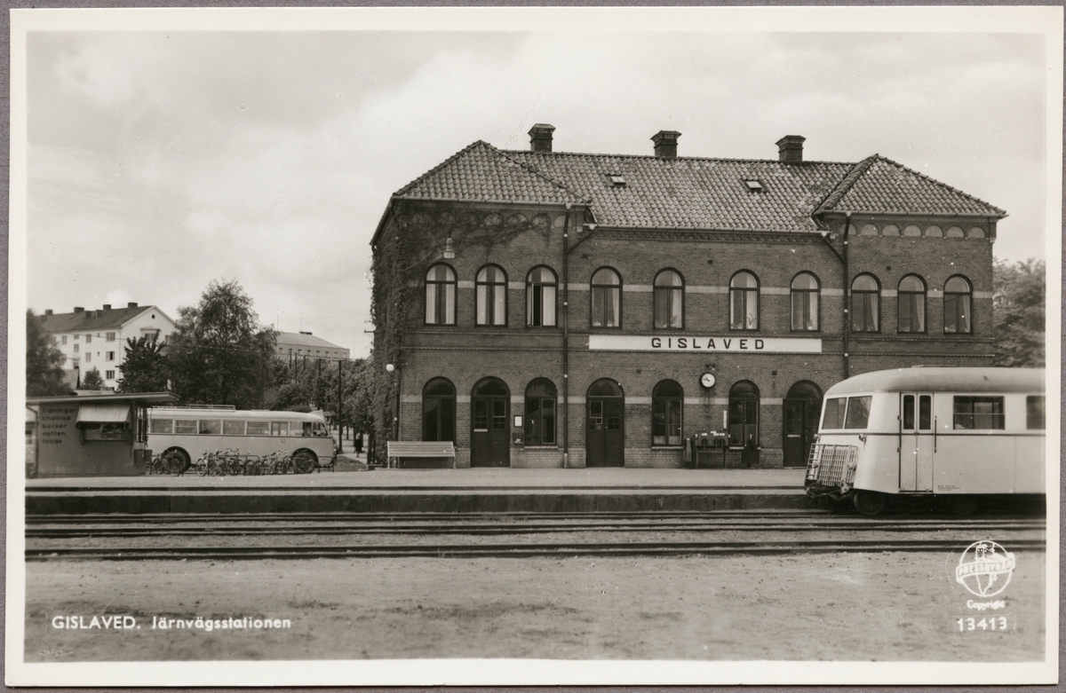 Titel: Spårsida av station med rälsbuss vid perrong och bebyggelse i bakgrunden.