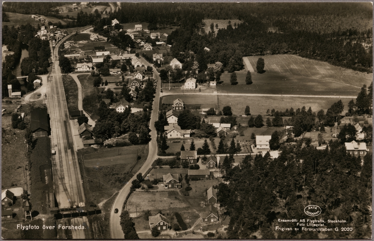 Flygvy över Forsheda samhälle med station och jordbruk i bild.