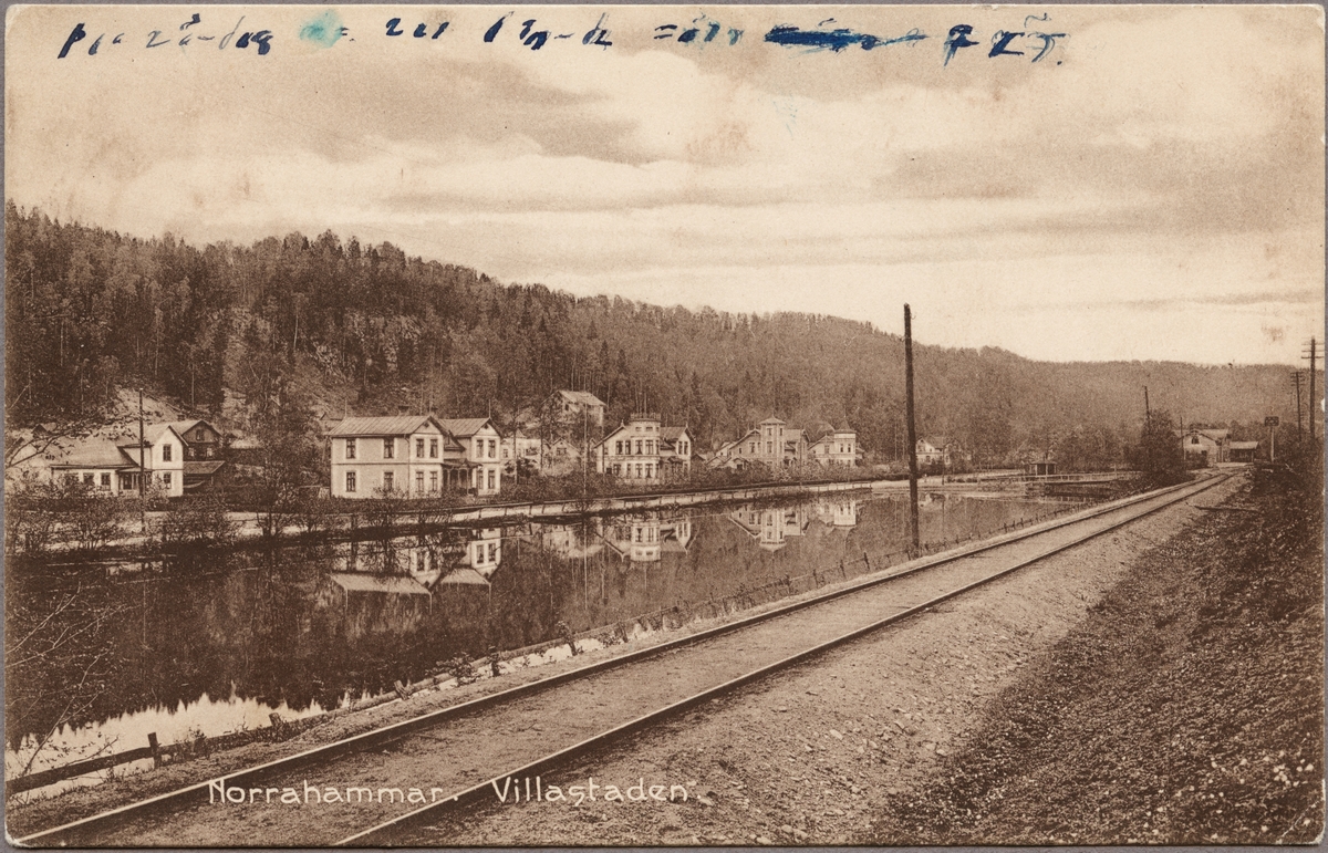 Vy på järnvägslinje vid del av Tabergsån med bebyggelse och järnvägsstation i bakgrunden.