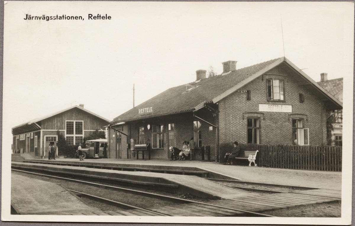 Titel: Spårsida av station med resande på perrong med buss och lagerbyggnad i bakgrunden.