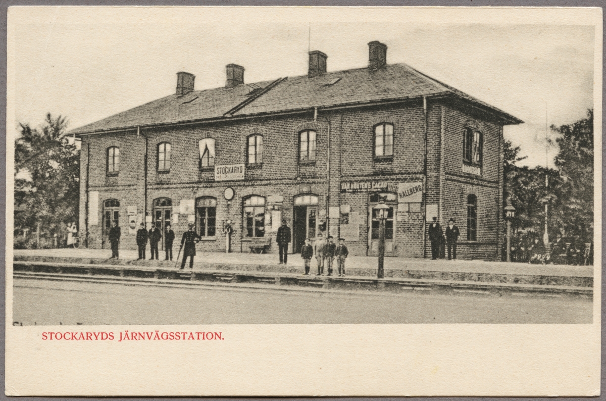 Titel: Spårsida av station med personal och barn på perrong.