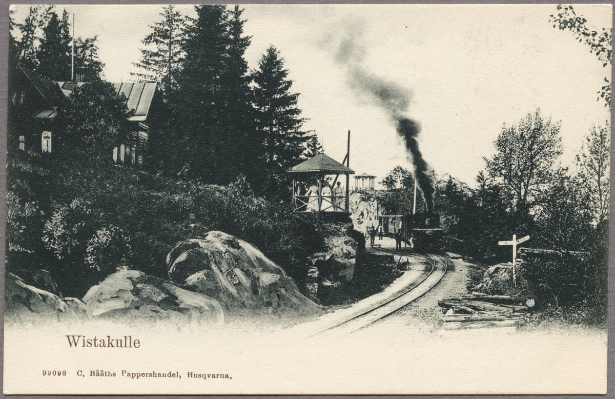 Titel: Vy på hotell och del av stationsområde med tåg.