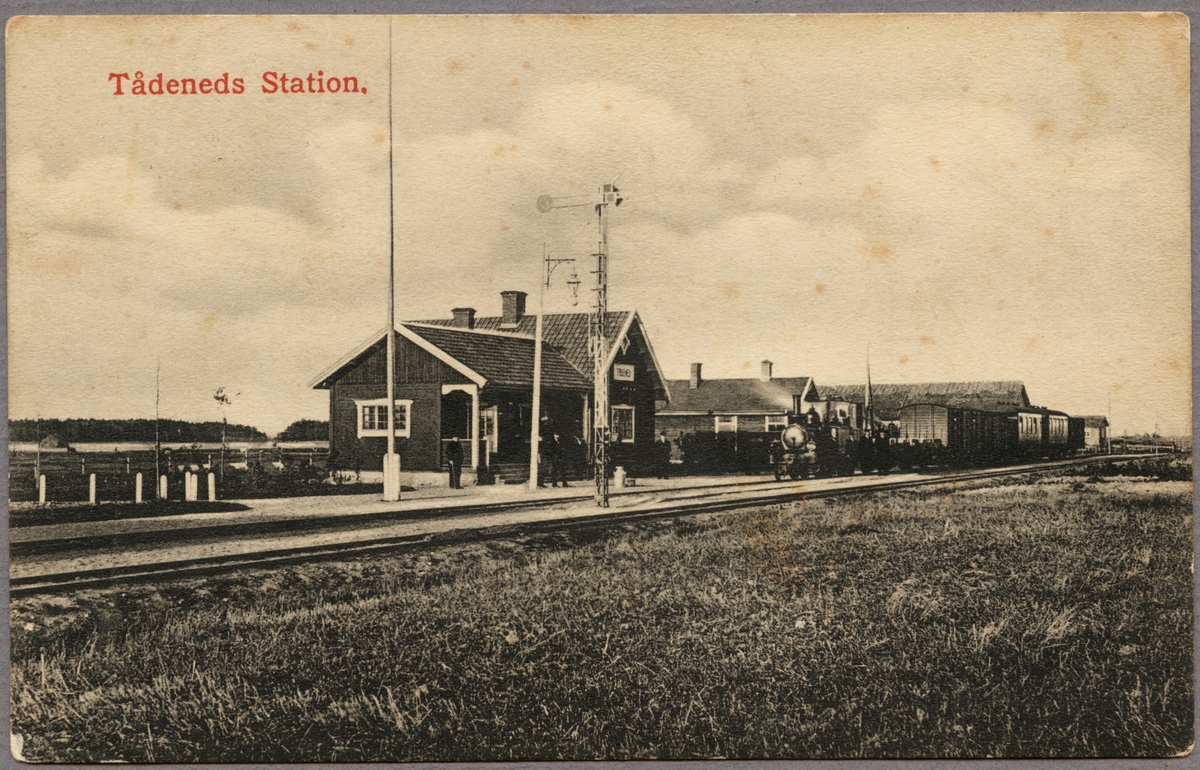 Titel: Spårsida av station med tåg på bangård och resande på perrong.