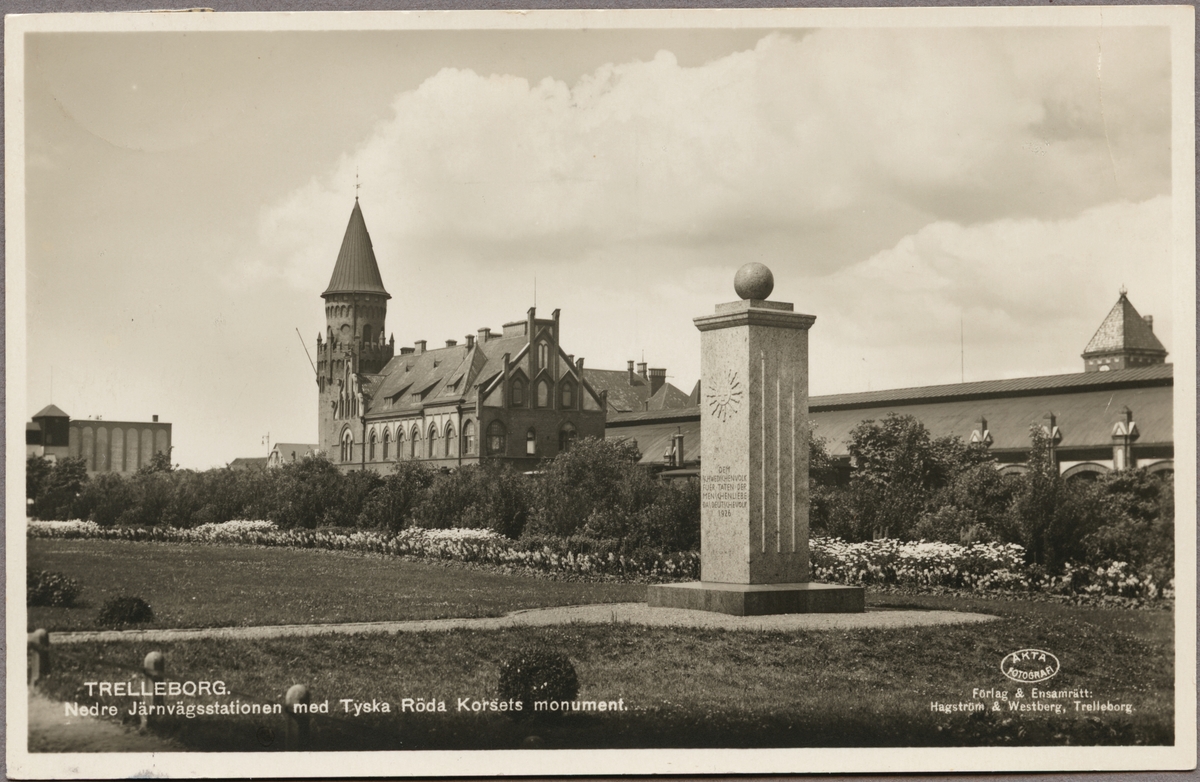 Trelleborg, tyska Röda Korsets monument med stationen i bakgrunden.