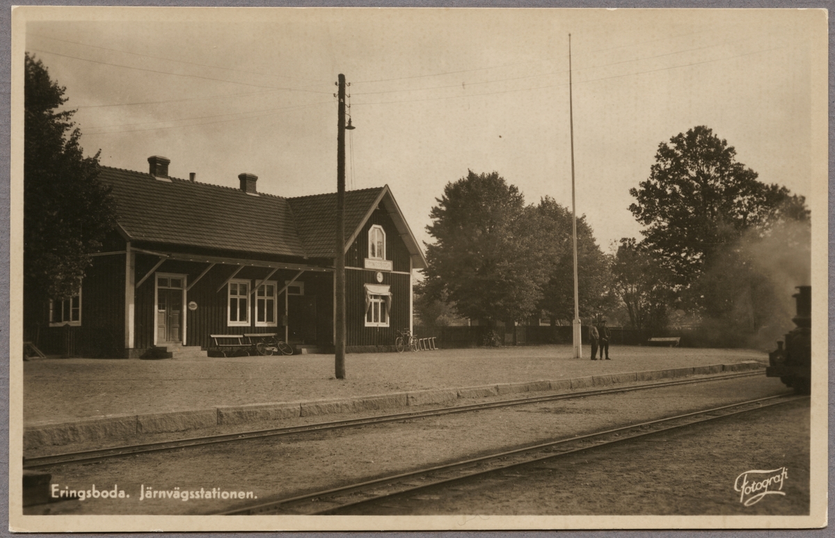 Titel: Spårsida av station med vy på stationshus.