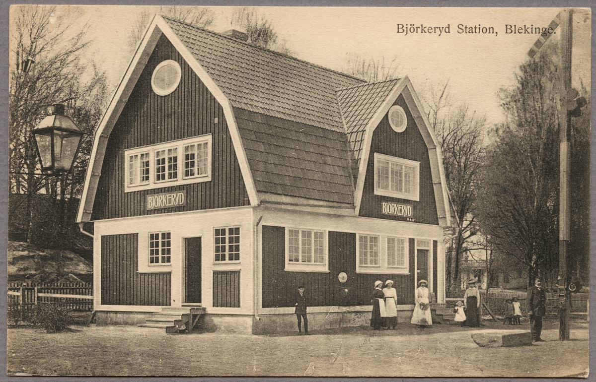 Titel: Stationsområde med stationshus och semafor samt kvinnor och barn i bild.