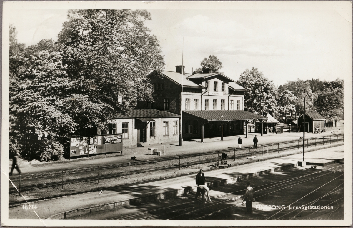 Titel: Vy på stationsområde med dressing och resande samt personal på perrong och bangård.