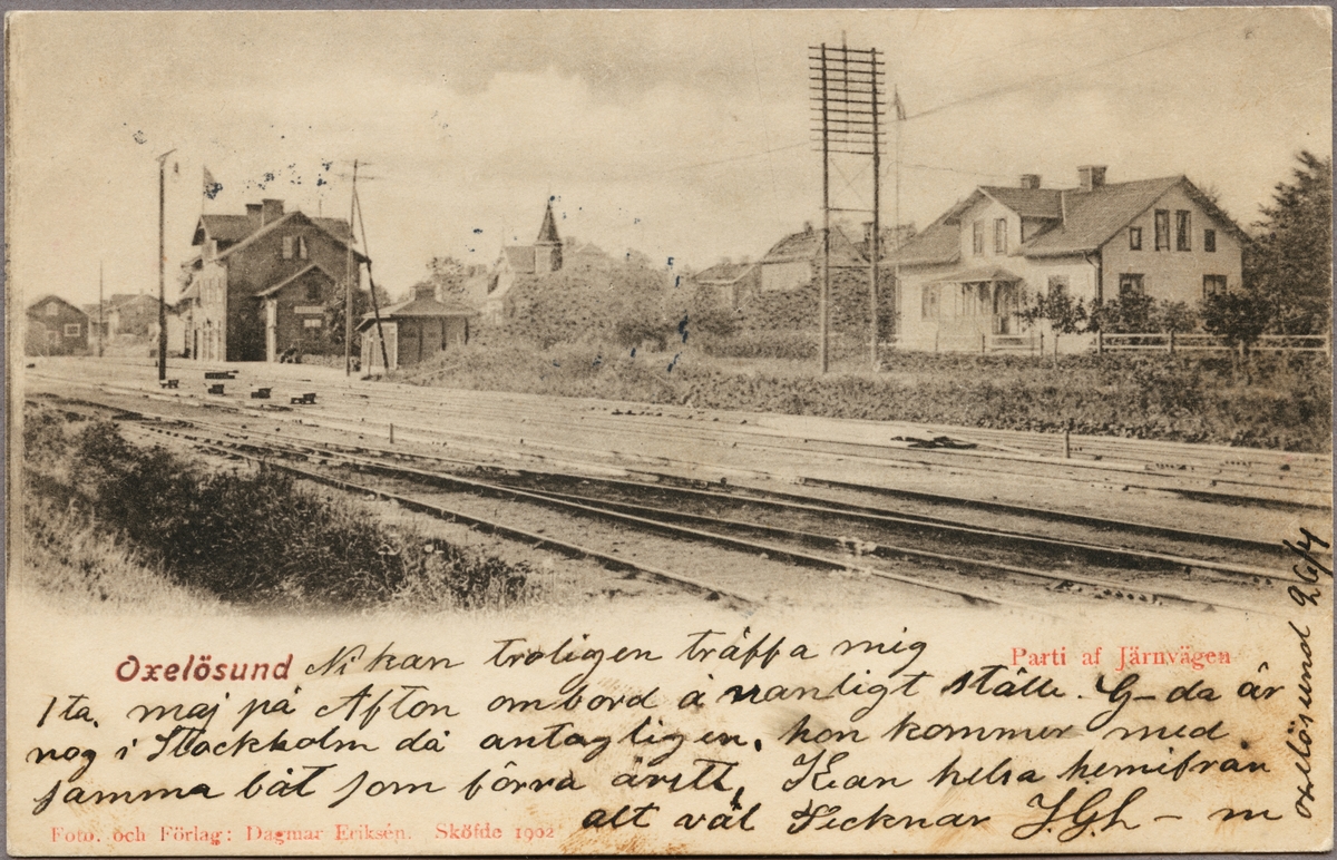 Bangård och stationsområde med bebyggelse i bakgrunden.