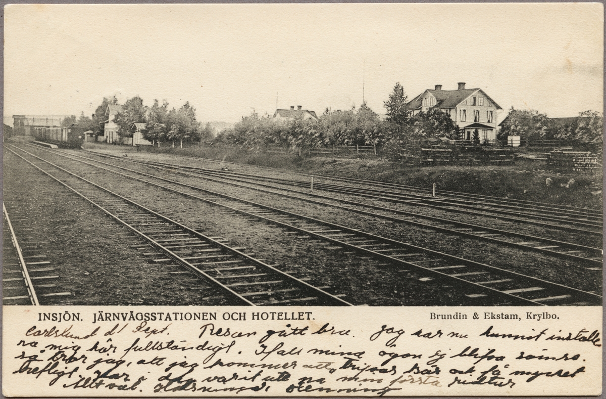 Titel: Vy på bangård och stationsområde med bebyggelse i bild.