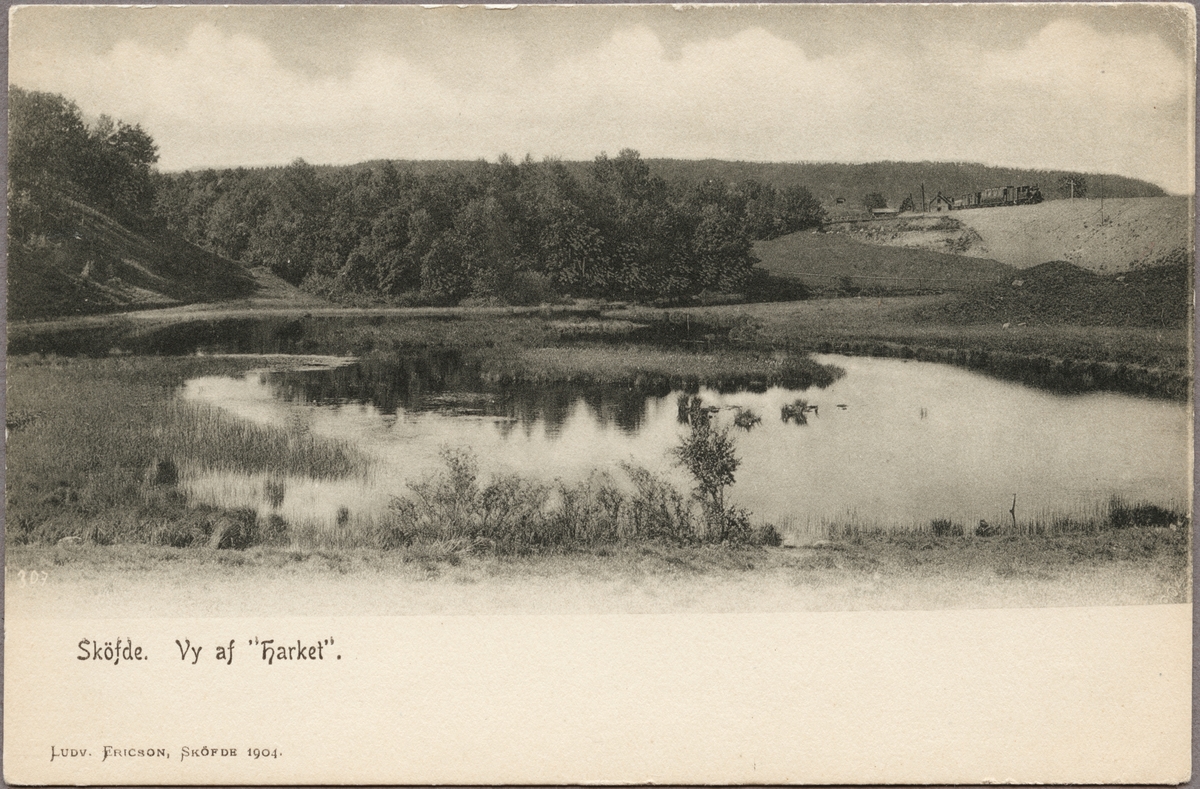 Titel: Vy på våtmark med järnvägslinje i bakgrunden mellan Skövde och Skultorp.