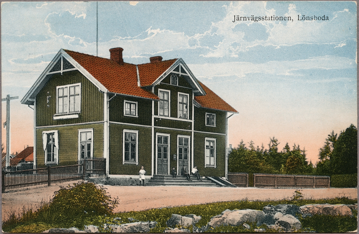 Titel: Gatuvy på stationshus och resande med semafor i bakgrunden.