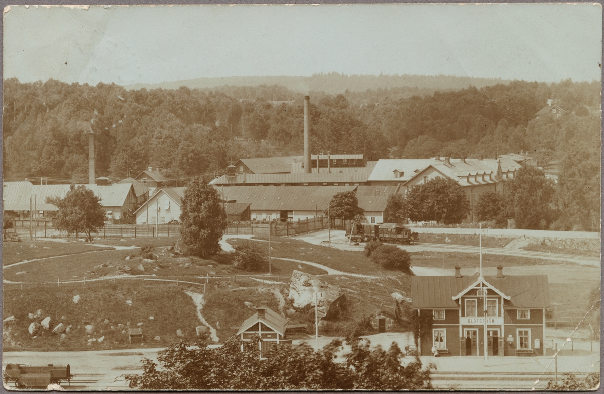 Titel: Vy över Olofström station och en industri i bakgrunden.
