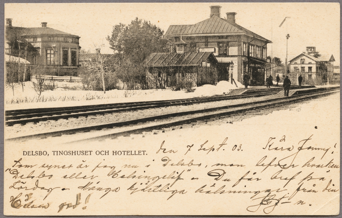 Titel: Stationsområdet i Delsbo med tingshuset till vänster i bild och hotellet bortanför stationshuset.