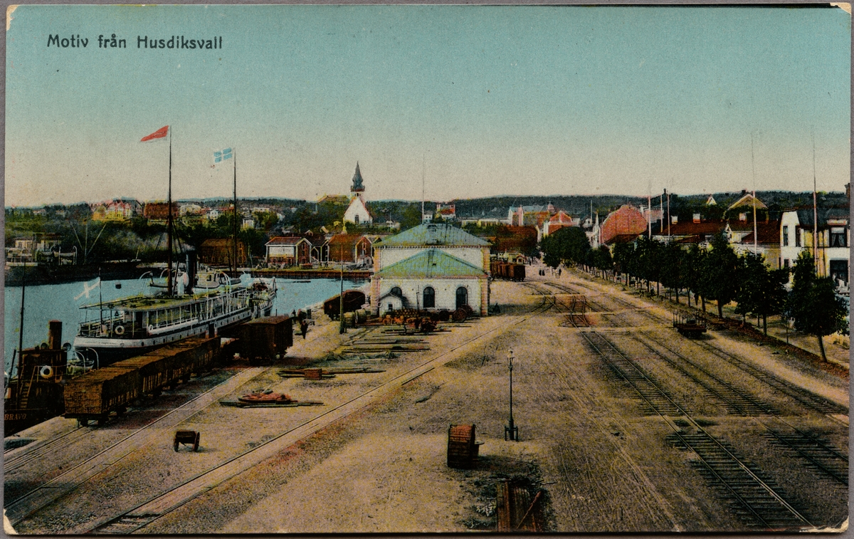 Kolorerad bild från Hamngatan i Hudiksvall, sett österifrån, med tullhuset i mitten.