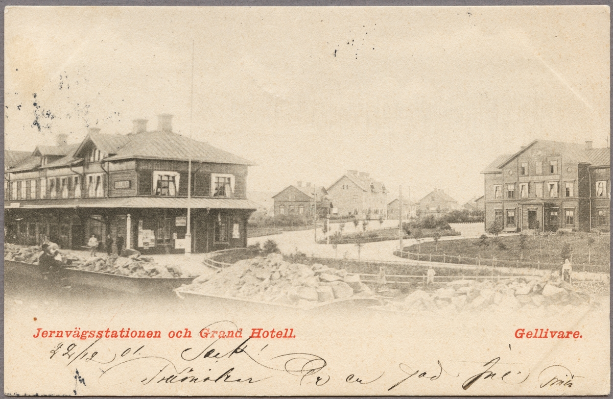 Vy från stationsområde på stationshus, hotell och bebyggelse med malmvagnar i bild.