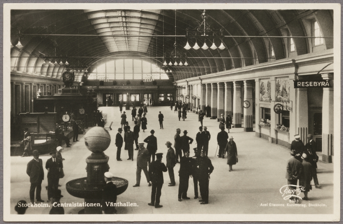 Titel: Vänthall med resande och personal vid Stockholm C.
