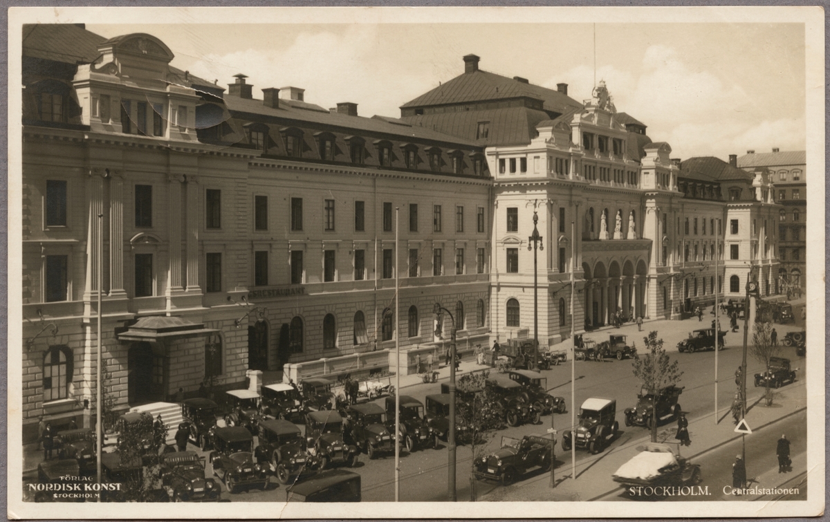 Titel: Gatuvy på stationshus och parkering med bilar.