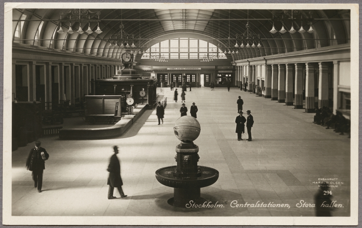 Titel: Interiör av stationshus och väntsal med resande i bild.