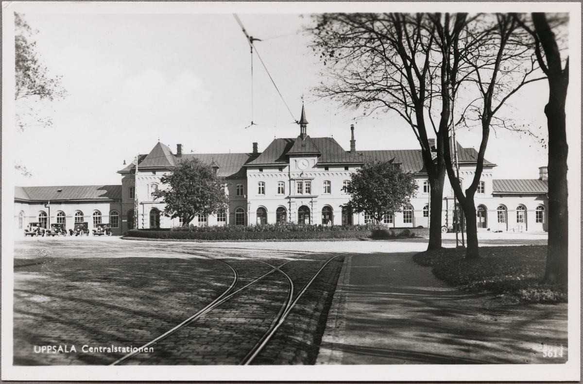 Titel: Uppsala centralstation och spårvagnsspår sedd från gatusidan.