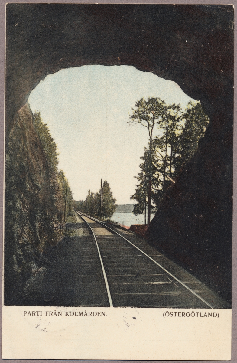 Titel: Vy från tunnel på järnvägslinje och del av Bråviken.