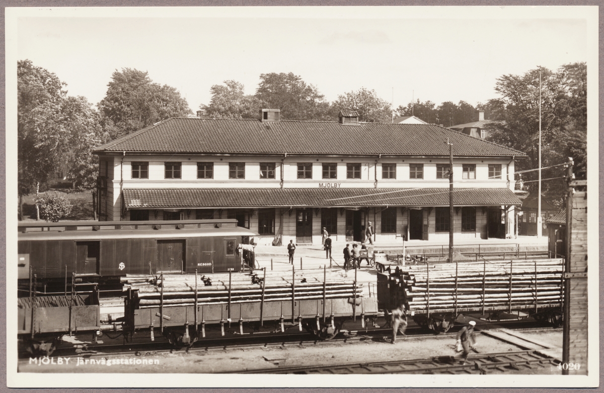 Titel: Vy på stationsområde och bangård med godsvagnar.