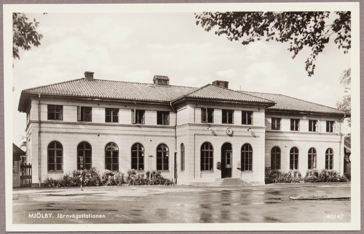 Titel: Gatuvy på stationshus och busshållplats.