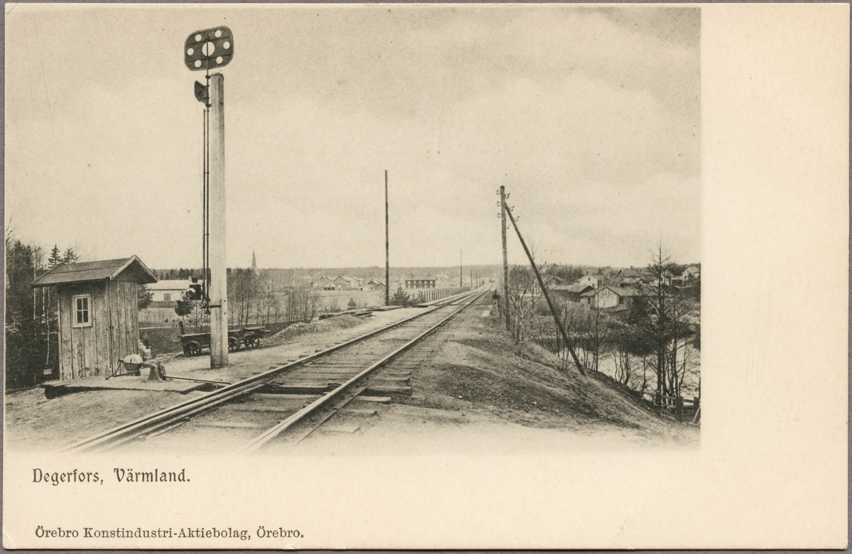 Titel: Vy på järnvägslinje och bro med semafor vid Letälven mellan Degerfors och Svartå.