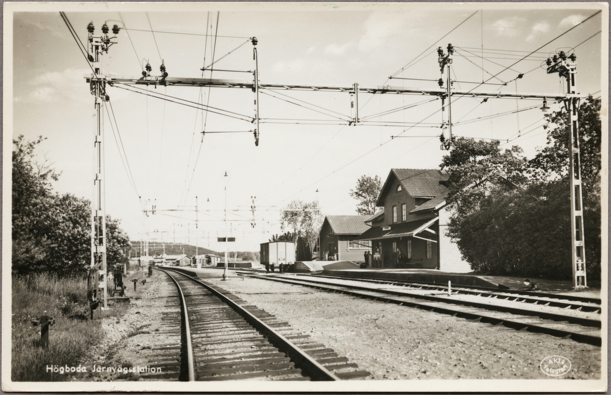Titel: Vy på stationsområde och elektrifierad bangård.