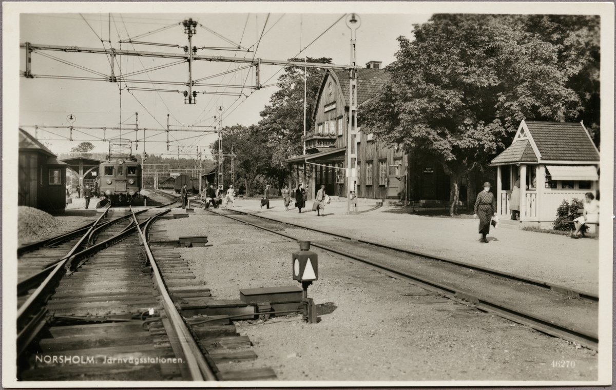 Titel: Vy på bangård och stationsområde med resande och lok i bild.