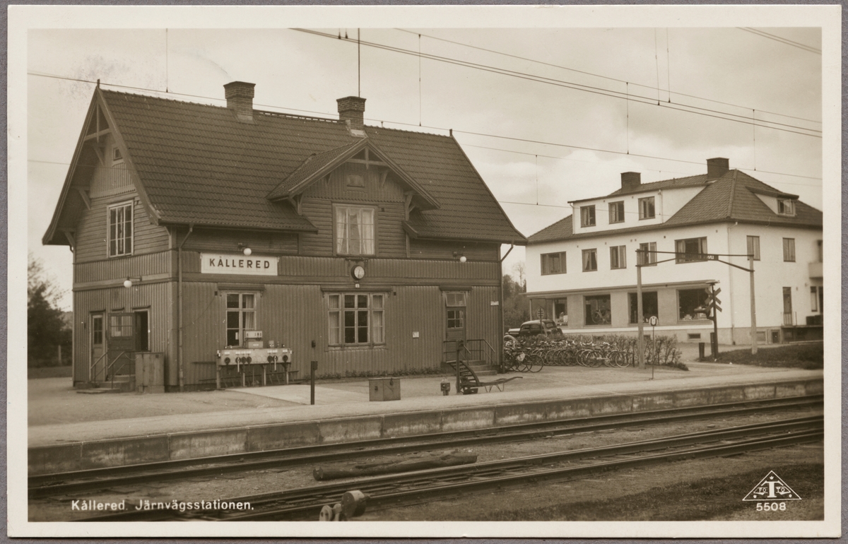 Spårsida av station med vy på stationshus med byggnad i bakgrunden.