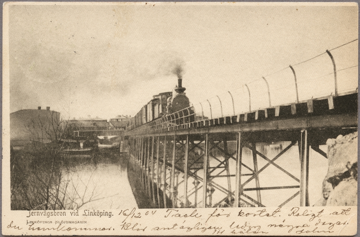 Titel: Järnvägsbro med trafikerande tåg över Stångån mellan Linköping C och Malmslätt.